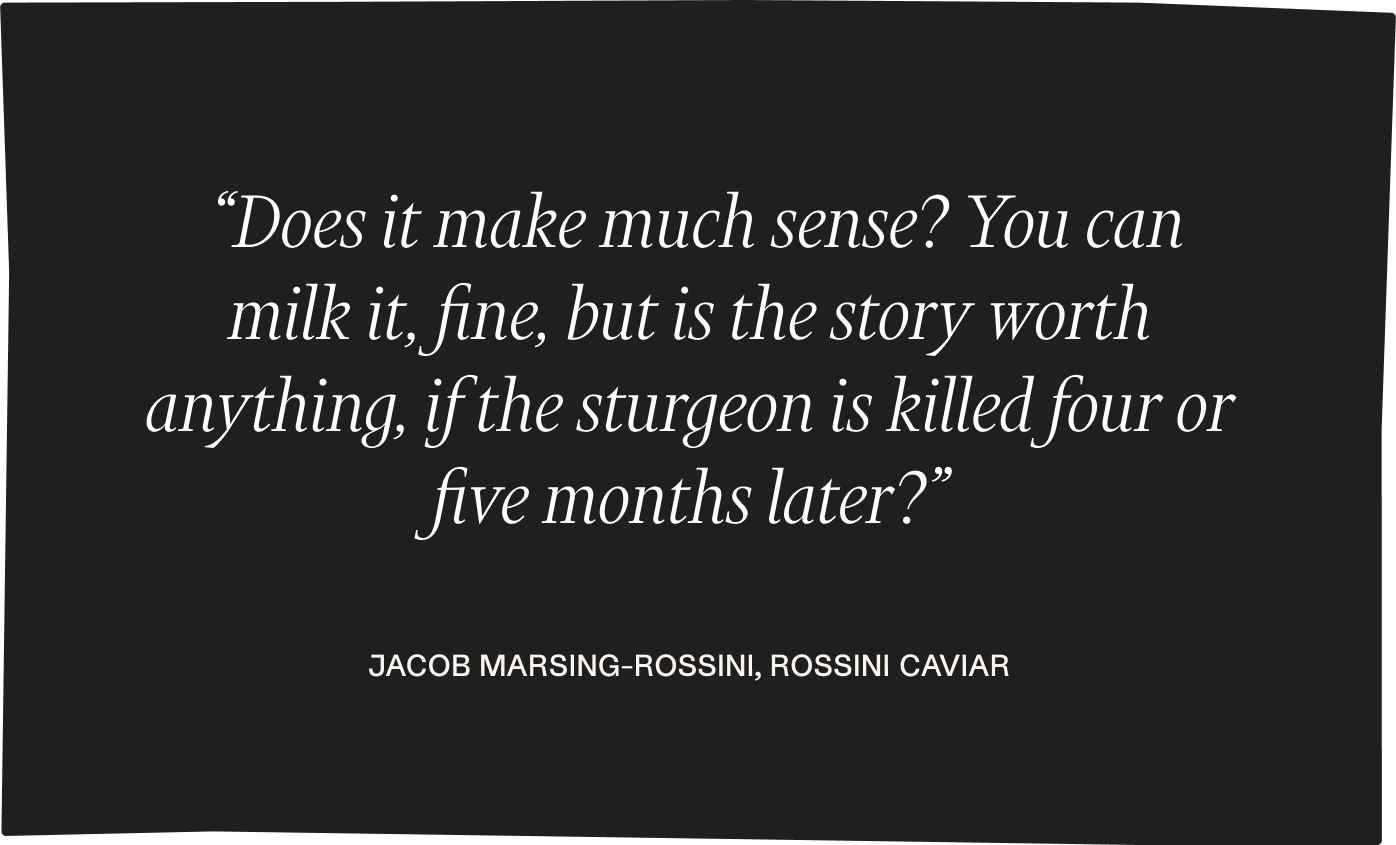 And stress, as we all know, can be its own killer. “Does it make much sense?,” asks Marsling-Rossini, whose caviar is produced using traditional slaughter methods. “Because you can milk it, fine, but is the story worth anything, if the sturgeon is killed four or five months later?