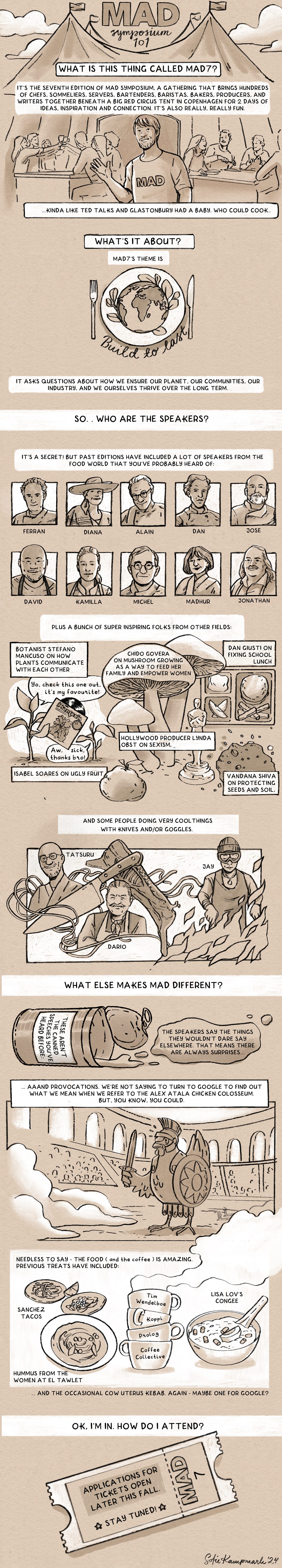 Last week, we announced the return of MAD Symposium on May 25-26, 2025. By the time the tent flaps open on MAD7, it will be seven years since the global hospitality community last gathered together in Copenhagen. Seven years is a long time in this business, and we realize that many of you may not even know what Symposium is. So we’ve asked genius illustrator Sofie Kampmark to help us explain it. Read on for the 101 on MAD Symposium.
